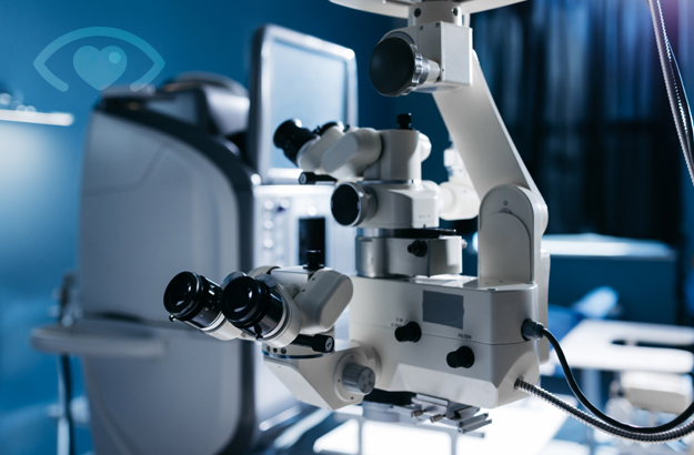 A microscope with a bright light is used to examine the structures of the eye, including the cornea, iris, lens, and anterior chamber, closely.